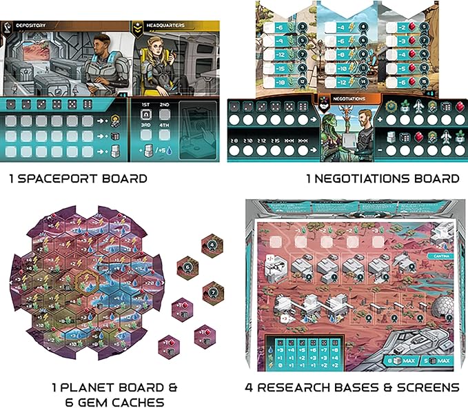 - Players will need to manage their crew (dice) as they visit various parts of the planet for trade, farming, construction and research