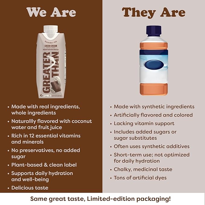 - COCOA CREAM, READY WHEN YOU ARE: Whether it’s a packed lunchbox, gym bag, soccer practice, after-school pick-up, a weekend hike, or a road trip, GREATER THAN is hydration that moves with you. The velvety, dairy-free cocoa cream flavor offers a rich, chocolatey sip made with real cocoa powder and organic coconut water—great for fueling busy days and active families.