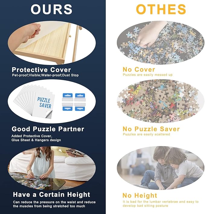 - 【4 Drawers and Puzzle Cover】4 Drawers provide extra surface space to work on which you can keep the pieces organized in the drawers instead of on the board itself, making it easier to see the big picture. Protective Cover helps a lot in organizing pieces and are easily able to put a unfinished puzzle away anytime