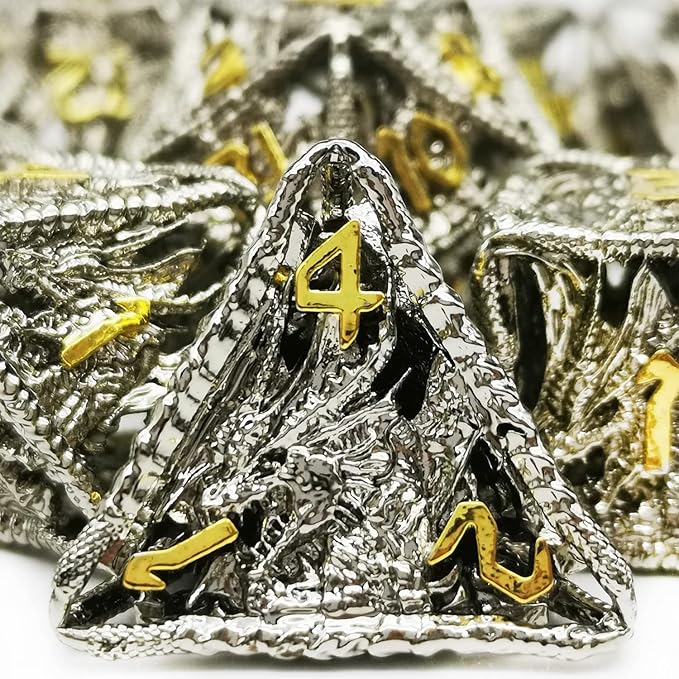 HAOMEJA Hollow Dragon Dice DND Metal Dice Set 7 Role Playing Dice D&D Dungeons and Dragons Dice (Silver)