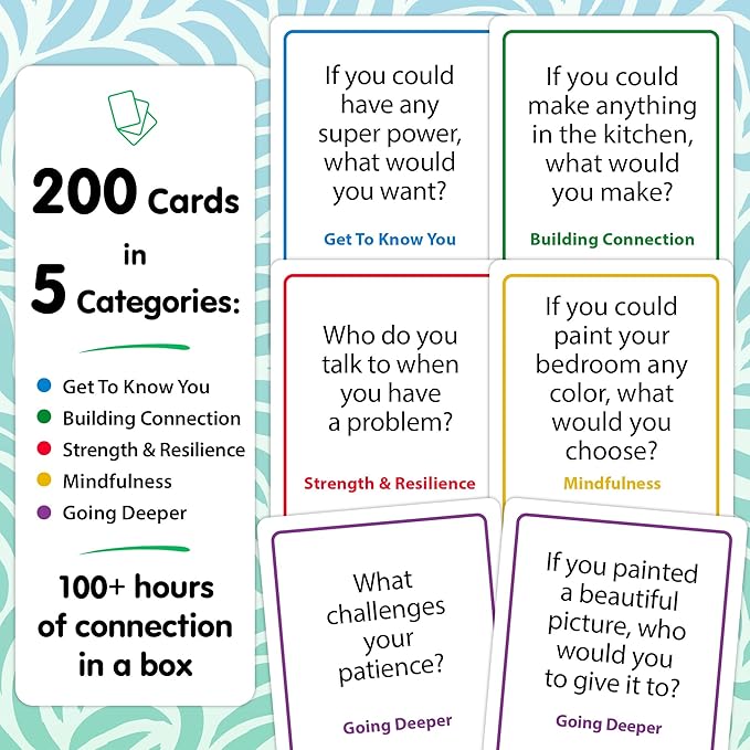 - ENCOURAGES DEEP, SAFE, AND MEANINGFUL CONVERSATION. The 200 conversation starter cards in the Support Pack are professionally designed by certified family counsellors and therapists to encourage deep, safe, and meaningful conversation between adults and children. Each card contains a thought-provoking question that will encourage participants to engage in safe and meaningful discussion and share their thoughts and feelings.