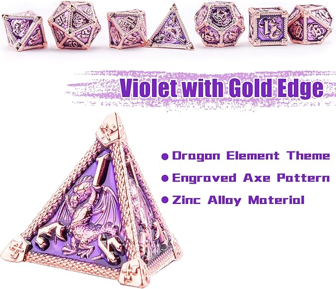 - 7-Die DND Dice Set - Package include 7 pcs dnd dice full set, there are D4 x 1, D6 x 1, D8 x 1, D10(0-9) x 1, D12 x 1, D20 x 1 and D%(00-90) x 1 violet metal with gold edge