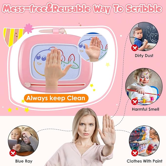 - ๐จRed/Blue/Green/Yellow Colors Zones: Magnetic doodle board for toddlers 1-3 displays 4 different colors that make childโs drawing more vivid. With 8.7" doodle pad, the toys for girls can be used repeatedly. Your one year old girl can easily pull the slide back and forth, then it will be clean immediately.