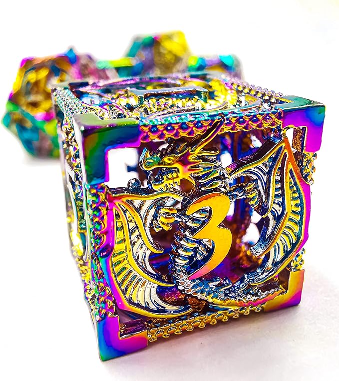 Metal DND Dice Set Dungeons and Dragon Dice Set Hollow Dragon Polyhedral Magic 7 PCS Dice Set with Gift Metal Box for Dungeons and Dragons Table Games Play Cards MTG(Dragon_Colorful)