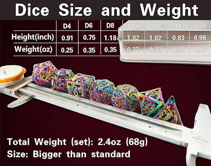 - 【Amazing Experience】: This DND dice is made of metal material. Compared to ordinary metal dice, this set is larger in size but lighter in weight. Its texture provides an excellent touching experience, and creates crystal clear sound like a wind chime whey in collision, which makes users so much fascinated.
