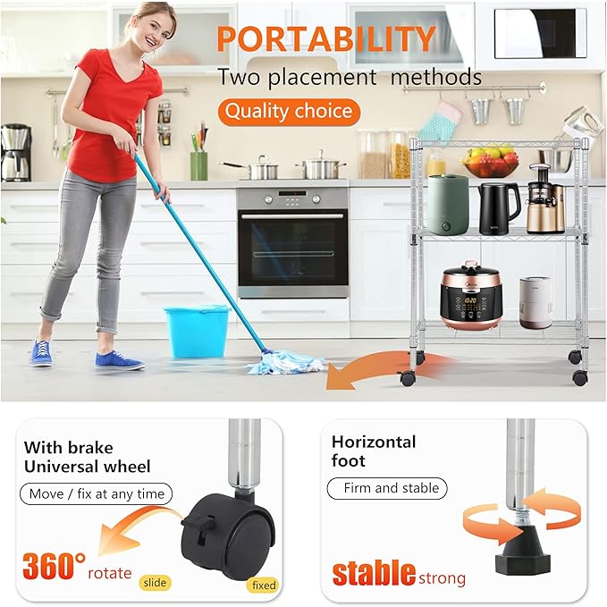 - ✔ [Strong bearing capacity] When the scaffold is equipped with foot nails, each layer can hold 150 pounds, with a total bearing capacity of 450 pounds. When the rack is equipped with movable casters, its total load is 170 pounds. The electrical rack in the kitchen can be used to place some commonly used living items without worrying about the deformation of the storage rack.
