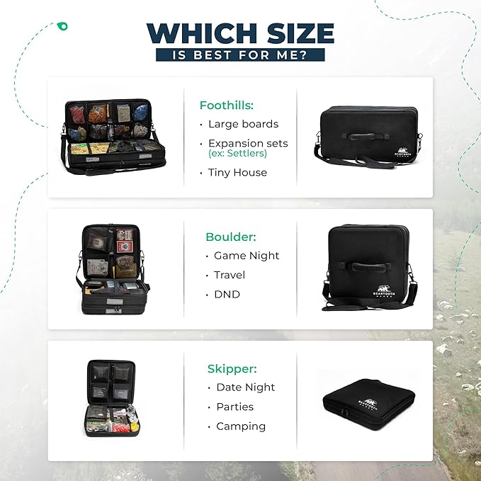 - The Skipper is the smallest size, designed for portability. Slide it under the seat in your car, put it inside your carry-on, or toss it in the stroller. Holds approx. 1-4 games.* The Boulder itself is the ideal carry on bag. Great for game night or travel! Holds approx 5-10 games.* The Foothills is great for storing entire game collections or traveling with a lot of games. Holds 10-15 games.* *Varies depending on size of the board game.