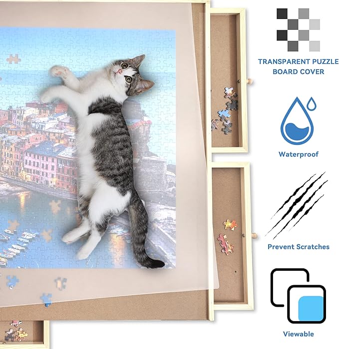 - Puzzle Cover & Easy Store - We provide a translucent puzzle cover to protect your puzzles from dust, water, and pets when you want to take a break. Our lightweight puzzle table is easy to store. When you complete your masterpiece, you can place the puzzle board under the sofa, on the table, or the floor