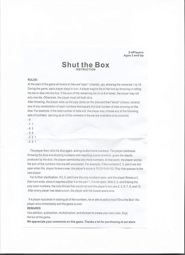 - CLASSIC SHUT BOX GAME - This wooden shut the box game will provide hours of fun wherever you go. It’s a perfect choice for Christmas Gift, Thanksgiving Day Gift, Birthday Gift, Children's Day Gift, or other special days for kids and teens