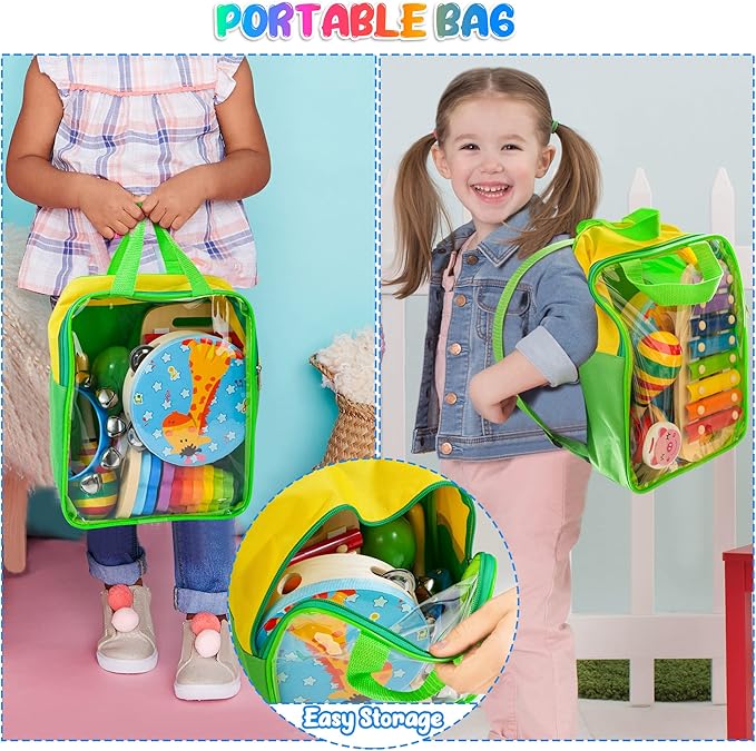 - 【Portable Storage Bag】Comes with a durable, clear, and ample storage bag that you can put all the toddler musical instruments in it. With portable handle and straps, musical toys for toddlers 3-5 can be easily carried or backpacked around.