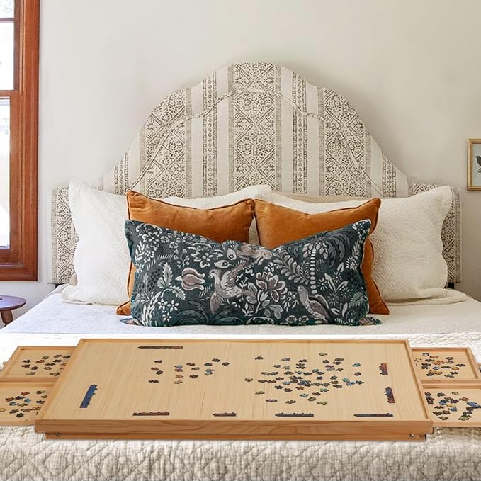- 【4 Drawers and Puzzle Cover】4 Drawers provide extra surface space to work on which you can keep the pieces organized in the drawers instead of on the board itself, making it easier to see the big picture. Protective Cover helps a lot in organizing pieces and are easily able to put a unfinished puzzle away anytime.