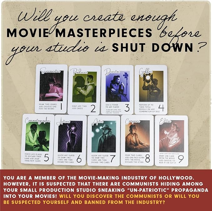- Lights, Camera, Action!: Players are set in teams of either Patriots, Communists, or The Rising Star, and take on their own unique job that affects the movies that get made each round.