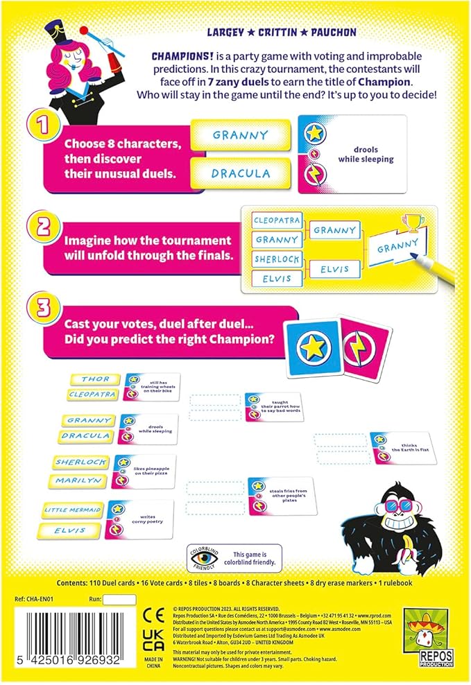 - FUN DUELING GAME: Champions! is a party game with voting and improbable predictions. In this crazy tournament, the contestants will face off in 7 zany duels to earn the title of Champion. Who will stay in the game until the end? It's up for you to decide!