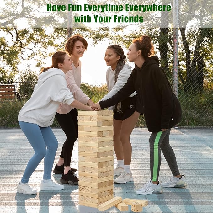 - The giant stacking outdoor games comes with 57 pcs Pine Block,1 pcs Dice, 1 pcs Durable Carrying Bag, 1 pcs White Scoreboard and 1 pcs Marker Pen. Each timber block measures 6*2*1.3 In,the tower yard games starts off at about 2 Ft and can go as high as 4.2 Ft while played.