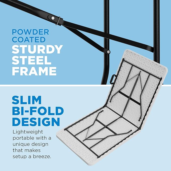 - HEAVY DUTY STURDY & STABLE - Lightweight and portable, this plastic folding table features an impact-resistant resin surface, waterproof & easy to wipe clean, and is supported by a heavy duty steel framework. The reliable anti-arch lock keeps it steady and stable on any indoor or outdoor surface.