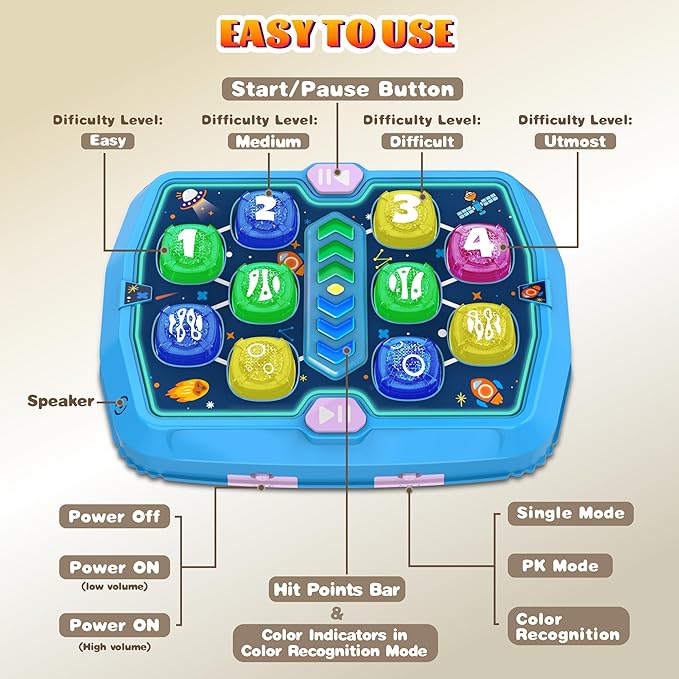 - 3 Modes for More Fun: This pounding toddler toy is an excellent tool for early childhood education and development. Three game modes including Single Mode, PK Mode, Color Recognition Mode.Four difficulty levels(Easy,Medium,Difficult, Utmost)and total 36 challenge levels.Each mode and level presents a new opportunity for growth and learning.This toy is a great choice for interactive fun!