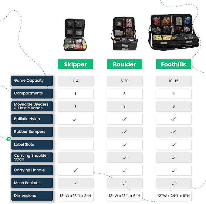 - The Skipper is the smallest size, designed for portability. Slide it under the seat in your car, put it inside your carry-on, or toss it in the stroller. Holds approx. 1-4 games.* The Boulder itself is the ideal carry on bag. Great for game night or travel! Holds approx 5-10 games.* The Foothills is great for storing entire game collections or traveling with a lot of games. Holds 10-15 games.* *Varies depending on size of the game.