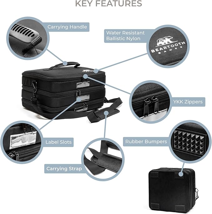 - This Features: Tough ballistic nylon exterior, Soft jersey velvet interior, multiple tiers for thorough organization*, internal mesh pockets, moveable dividers, elastic straps, rubber bumpers*, carrying handle, label slots*. Foothills Dimensions: 24”L x 12”W x 6"H empty. Boulder dimensions: 13”L x 13”W x 6"H. Skipper dimensions: 13”L x 13”W x 2”H. *Not found on the Skipper.