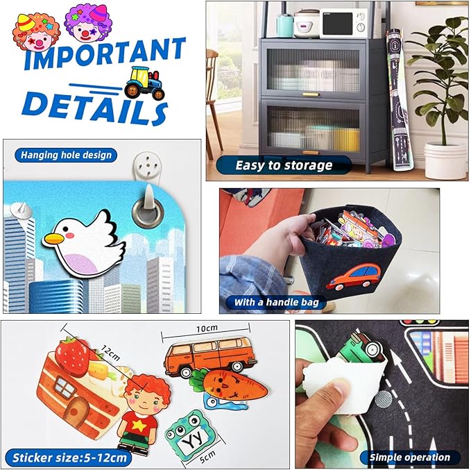 - 200 PCS Various Stickers and Cute Felt Basket: There are over 200 pieces.Comes with cute basket,large mat and various velcro pieces,such as airplanes, plants, letters, numbers, animals, characters, houses,etc.. 40X28 Inch Large size to make several kids play together and create their own stories with various felt pieces,develop teamwork skills,as well as improve their communication and social skills.Great for building children's imaginations,improve their hand-on ability
