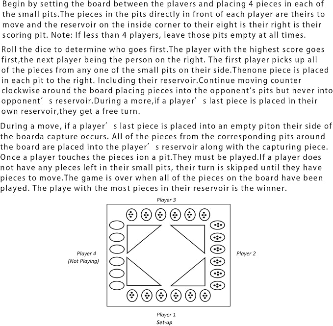 - Easy to Play: This ancient strategy game can be played by two to four players on this board; the objective of a two-player game is to capture more stones than the opponent; in a four-player games, one usually seeks to leave a rival with no legal move; each player takes turns to select a group of stones from one cup on his/her side of the board, and each stone is dropped one by one in the cups around the board, including his mancala but not the opponent's