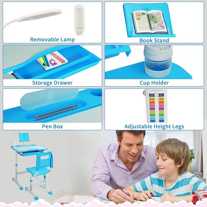 - Solid Structure: Kids desk and chair set are made of high quality plastic panels, constructed with iron frame, ensures great stability and durability. It can support up to 189.6lbs/86kg. The rotatable book stand can hold the book at the proper distance and protect the eyes.