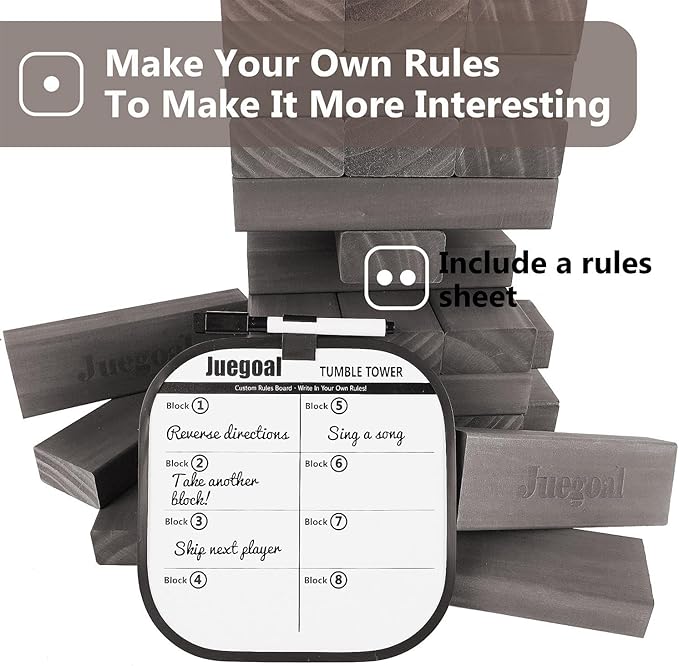 - Giant Size Timber Game Set: Juegoal large size grey color giant tumble tower set comes with 54 pieces wooden tumble blocks, 1 pcs game board with pen and a zipper bag. Each block is 6.9 x 2.3 x 1.2 inch, 2FT (18 rows) could be grown up to 4FT tall tower when played. A great fun, fast-paced stacking game and indoor or outdoor playing game for all ages