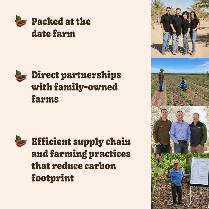 - FARM TO TABLE: Our organic Medjool dates are grown, harvested, pitted, and filled with natural peanut butter and cacao from our sustainable family-owned date farm.
