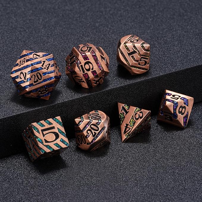 Metallic Glitter Stripes D&D,DND Metal Dice,7pcs Polyhedral Dice Set with Gift Case for D&D Tabletop Game (Antique Red Copper Seven Colors)