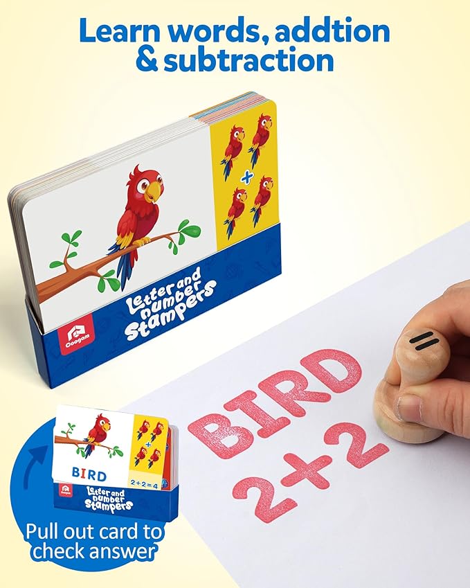 Coogam Wooden Alphabet Number Stamp Flashcard, ABC Spelling Letter Stampers and Mathematics Learning Number Stampers Arts and Crafts Supplies, Montessori Educational Toy Gifts for 3 4 5 Year Old