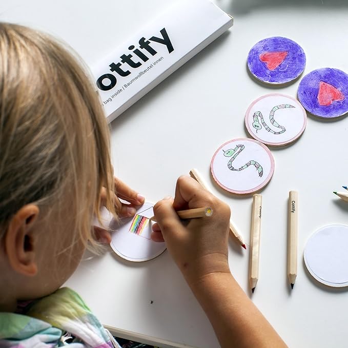 - ALL INCLUSIVE KIT: This arts and crafts kit includes all the materials to create 36 colorful matching cards for toddlers 2-4 years. The set includes 36 wooden cards with blank front and printed back side, 48 blank replacement stickers, set of colored pencils and cotton bag to store and carry toddler card games around. Among the craft kits for kids this is the one to start with. Whether the result will be toddler matching game or colorful flash cards, kids love to play their own game.