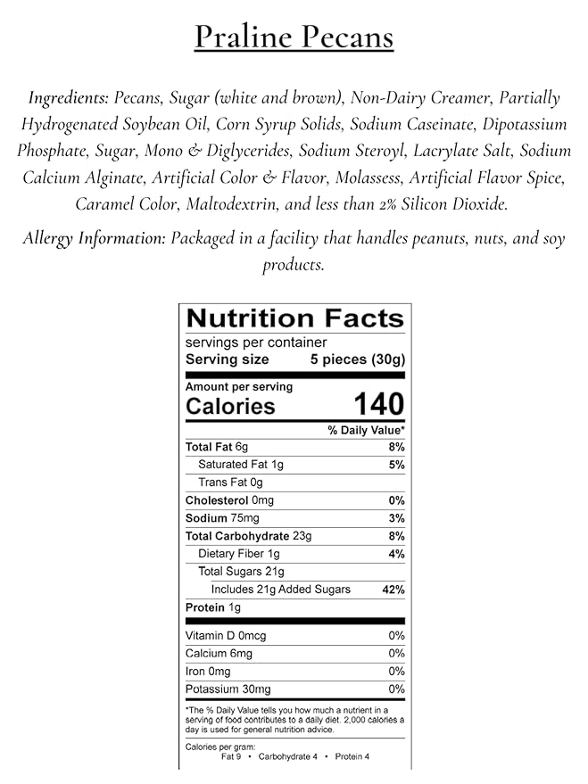 - PERFECT TREATS: Indulge in our delicious praline pecans nuts without the guilt. Pecans pack a nutritional punch with healthy fats, fiber, antioxidants, vitamins and minerals.