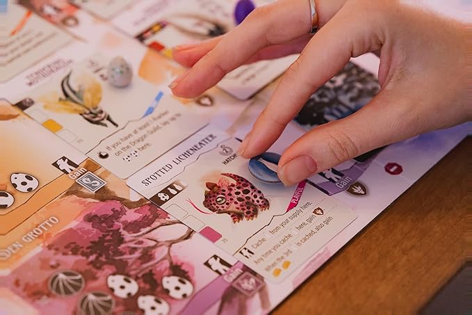 - THEMATICALLY DESIGNED MECHANISMS: The chaining of dragon powers by using the adventurer meeple down the cave activating the dragons that live there which makes it feel like you are walking through the cave. The hatchlings hatch from eggs, and their cost is milk and eggs, as though you were nurturing them. Their benefits also grow, as the hatchling would, and it gives you a one time benefit when the hatchling ages up.