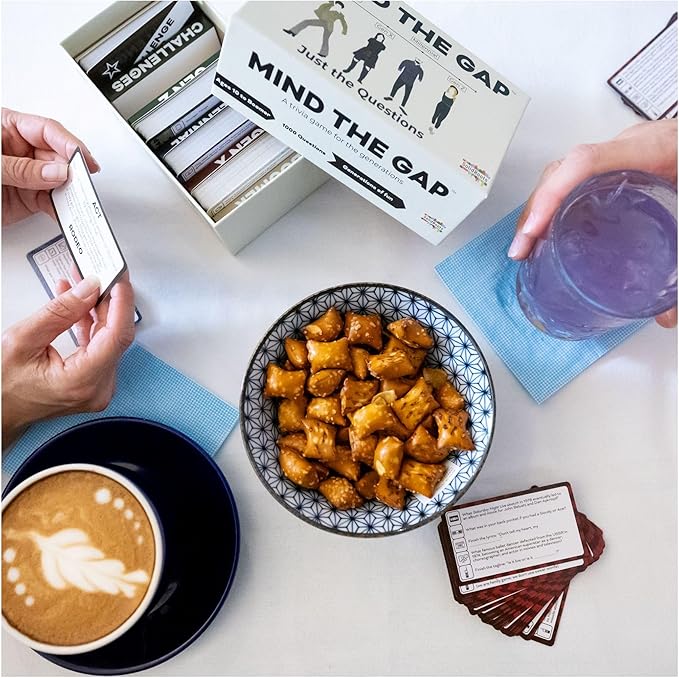 - NOT JUST AN EXPANSION: With 1000 all-new questions and 50 more Challenge Cards, Just the Questions is the perfect addition to the base Mind the Gap game OR just get this to create fun conversations and waves of nostalgia Same categories: TV/Film, Pop Culture, Headlines, Music, & Slang from the Boomer, Gen X, Millennial, and Gen Z generations