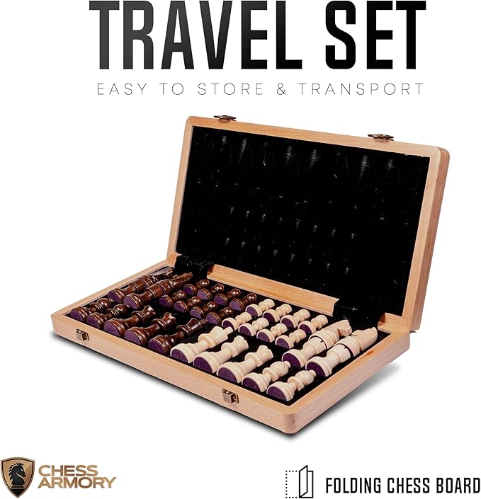 - PREMIUM QUALITY BOARD - We take pride in our products your Beech Wood board has a maple and walnut playing surface with hand sanded beveled edges. The set comes in a beautiful full color gift box excellent for gifting. Keep your board out on your coffee table as a gorgeous conversation-starting centerpiece.| TRAVEL STORAGE - The 15 inch folding chess set with inside storage is designed to preserve your pieces from bouncing around and damaging each other. Keeping your pieces secure and accounted for with a unique cut-out space for each piece even when you are Traveling.| PERFECT GIFT FOR CHESS LOVERS - Make every occasion memorable with Chess Armory's Walnut Wood Chess Set – the best most elegant gift for everyone! Unmatched quality for adults endless fun for kids – it's not just a gift it's the only gift you'll ever need. Make your mark with Chess Armory where every gift becomes a timeless experience!| FREE ONLINE COURSE - To help get you going every Chess Armory chess set comes with a free 5-hour online course taught by our in-house chess expert. Learn tactics strategies and openings right out of the box.| WORLD CLASS CUSTOMER SUPPORT - Based out of Houston TX our staff is here to help you on your chess journey. We strive to have zero issues with your new chess set but in case you do need help with your product we are here to swiftly and immediately resolve your concerns