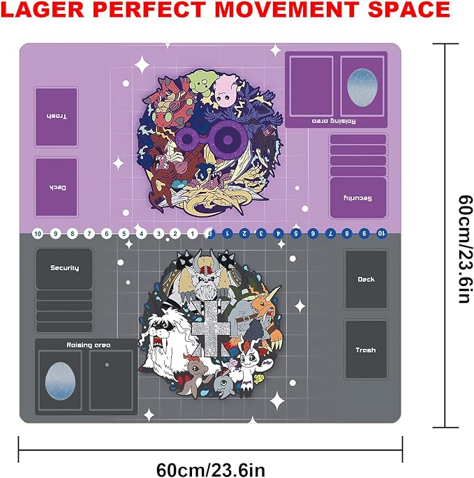 - Waterproof Surface: Featuring a waterproof surface, this Playmat effectively guards against liquid penetration and stains. Whether an accidental beverage spill or the occasional snack mishap, a simple wipe-down restores the playmat to its original condition, providing you with a long-lasting and durable gaming experience. Ideal Size: The Playmat measures 60*60CM (23.6in*23.6n),