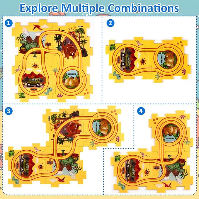 - 【Four Different Themes】: A set of jigsaw track cars includes four themes: dinosaurs, oceans, forests, and space. You can use these accessories and small cars to simulate the driving scenario of a small car A very rich and interesting set!