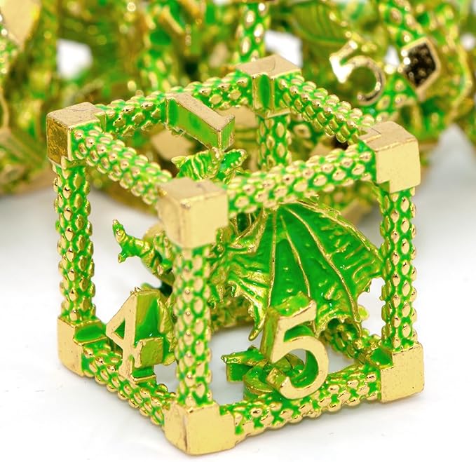 - 【Game Dice for Dungeons and Dragons】Hollow Dragon Dice Gorgeous box with foam liner is perfect for holding dice. Easy to carry and a great gift for DND game enthusiasts. Set of 7 metal dice including D4, D6, D8, D10 (0-9), D10 (00-90), D12, D20.When you roll the dice, they will make a wonderful crisp jingle