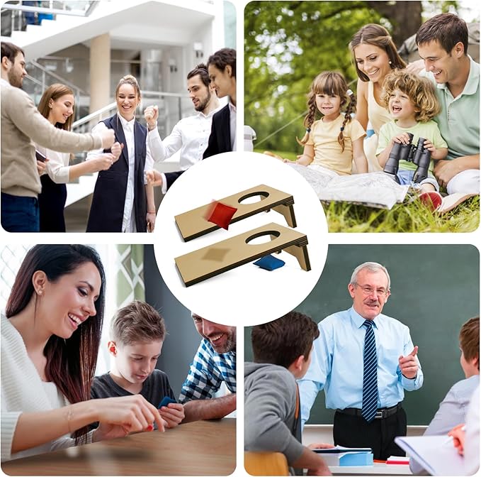 - Mini Tabletop Design - Package includes 2 cornhole boards and 4 red 4 blue bean bags for 2-4 player fun! Each board measures approximately 4.7"W x 7.7"L. Please notice the size reference before making any order.