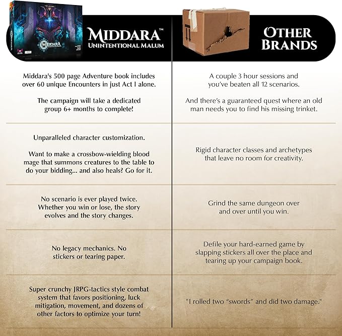 - TIMELESS FUN FOR EVERYONE: With over 60 Encounters in Act 1 alone, Middara will keep your party busy killing monsters, getting loot, and leveling up for months! As your party of 1-4 players embark through these encounters (each taking 45 minutes to 3 hours), your decisions will echo through the story arch and take you on branching paths that lead to multiple, unknown endings…