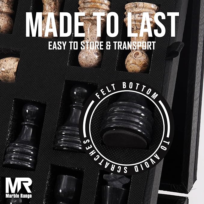 - Includes everything you need: 1 x marble chess board, 32 x chess pieces, plus 2 extra queens for advanced gameplay. You’ll receive 2 Kings, 2 Queens, 4 Knights, 4 Bishops, 4 Rooks, and 16 Pawns — all stored safely in a Marble Range branded storage box with secure fragile packaging.