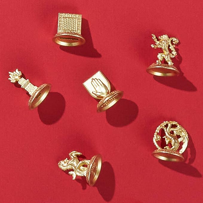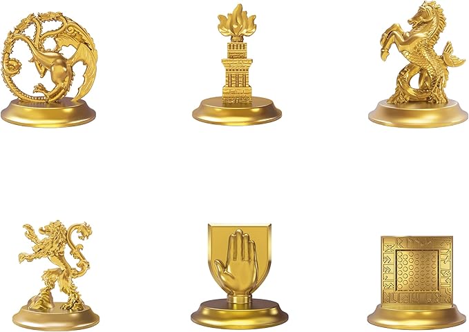 - 6 GOLDEN ZINC TOKENS: Includes 6 golden game tokens: House Targaryen, House Hightower, House Velaryon, House Lannister, House Strong, and House Royce. Who will you pledge loyalty to.