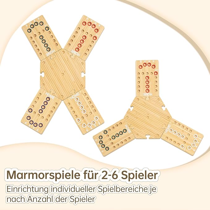 - 【Classic Marble Board Set】Made from high-quality wood with a 6-color painted design and text instructions for easy navigation from start to finish. The marbles game comes with a center-hub for 2-6 players and 6 individual play areas, 24-colour marbles 6 dice, and a velvet storage bag. The wooden game board can be assembled according to the number of players. And detailed instructions so even beginners can get started quickly