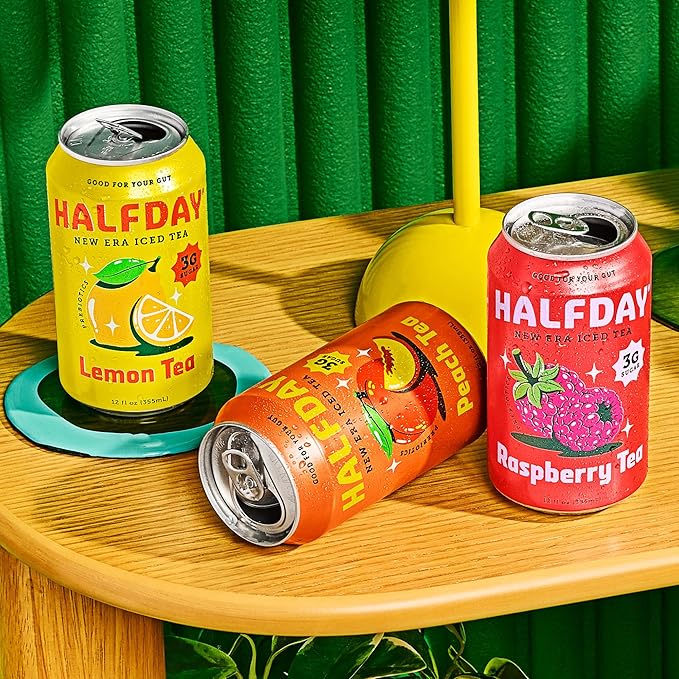 - NEW ERA ICED TEA: Gut-friendly iced teas that make moments of freedom even sweeter. Made with just 3g of sugar, 6g of prebiotic fiber and nothing artificial, Halfday is iced tea for the new era.