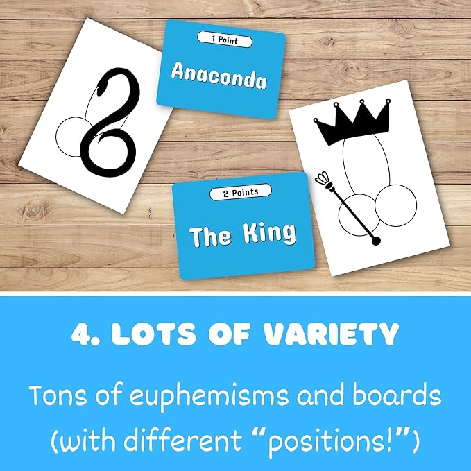 - WHAT’S INCLUDED: 8 Dry Erase Art Boards (featuring different “positions!”), 80 euphemism prompts, 4 very stiff dry erase markers.