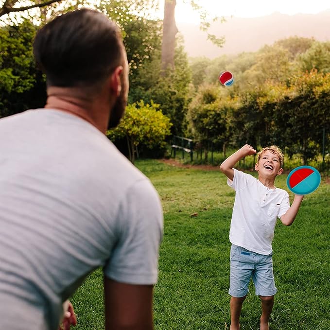 • 【Softer and High-quality Ball Set】The old version's tennis balls were very hard and lacked elasticity, making them difficult for kids to catch. Our balls are much stronger and softer, yet still have great stickiness, so kids can easily catch them and enjoy a comfortable feel. Kids won't lose their fun because they can keep catching the ball. This ball game is always lots of fun for little ones, even at family reunions.