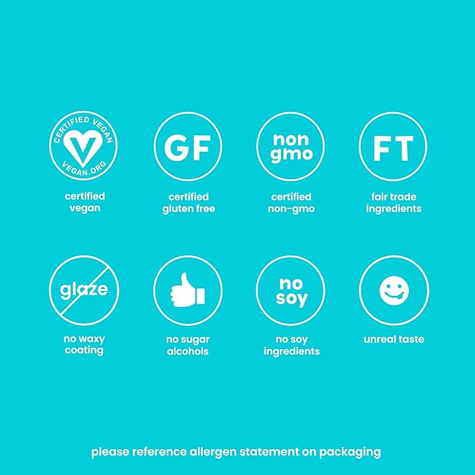 - UNREAL QUALITY: Our chocolates are made in small batches and are certified vegan, gluten free, Fair Trade, and non-GMO. We also believe in using certified sustainable palm oil, and you’ll never find any artificial flavors, preservatives, or fillers!