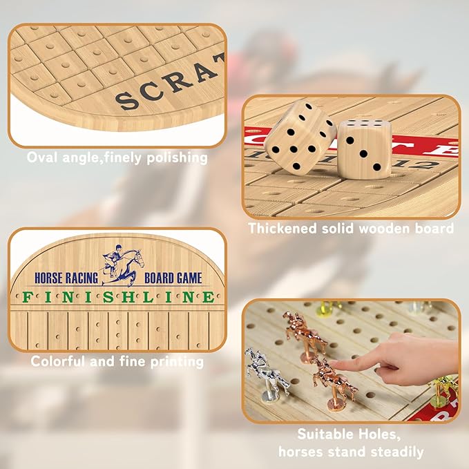 - 【Easy to Play For All】The horse racing game is easy to learn and great for players of all ages with different skill levels. Each player chooses self favorite horse, then rolls the wooden dice to determine which horse can move forward ( for example, sum of dice is number 6, the horse marked "number 6“ can move forward along its track) and each competitor has an equal chance at victory. The horse that reaches the finish line is a win! It's that simple! PS: The horse racing board game can accommodate up to 11 players.