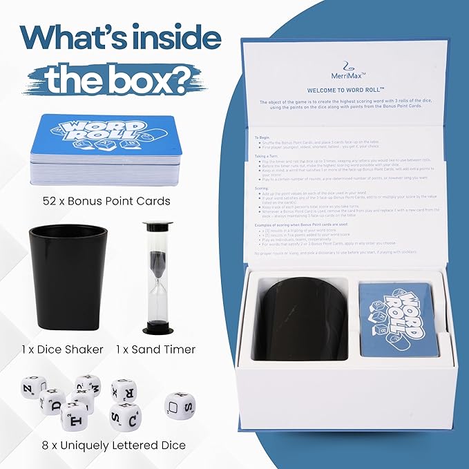 - HOW TO PLAY: Start by shaking the dice in the shaker included in our family game for kids and adults, and rolling them out to reveal your letters! Use the bonus point cards to enhance your word combinations and score points. Play against the sand timer, challenging yourself and your friends during family game night to think fast and create words on the fly. Perfect for 2+ players, Word Roll is an endless card game full of creativity, making it an ideal addition to your party games!