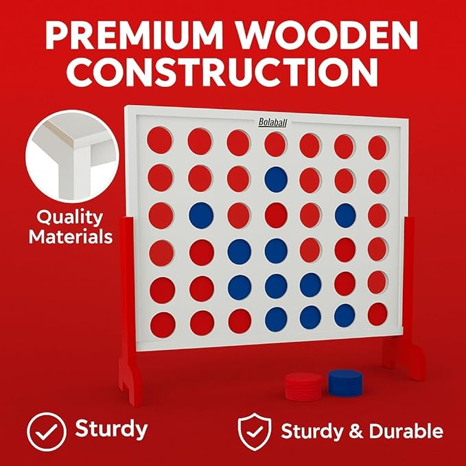 Bolaball Giant Wooden 4-in-a-Row Game – 4FT Jumbo Connect Game for Kids & Adults, Indoor & Outdoor Fun, Durable Design for Family Gatherings, BBQs, Parties & More