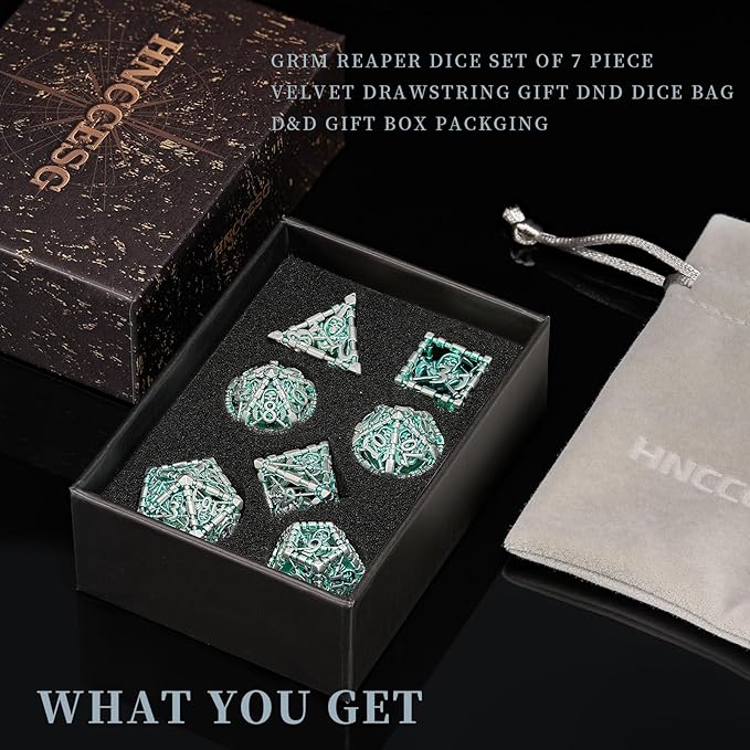 DND Hollow Polyhedral Dice Set, Metal Green White Grim Reaper of 7 Piece Role Playing Dice, for Dungeons and Dragon Dice or RPG MTG Table Game(Green and White)